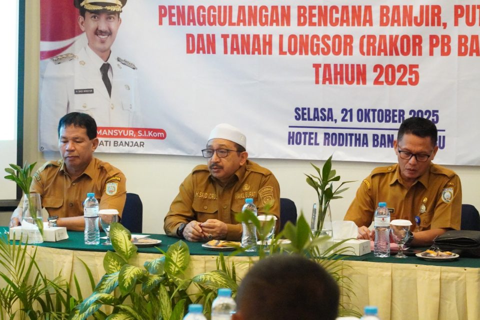 MARTAPURA – Badan Penanggulangan Bencana Daerah (BPBD) Kabupaten Banjar menggelar Rapat Koordinasi Penanggulangan Bencana Banjir, Puting Beliung, dan Tanah Longsor (PB Batingsor) Tahun Anggaran 2025, bertempat di Hotel Roditha Banjarbaru, Selasa (21/10/2025) pagi.