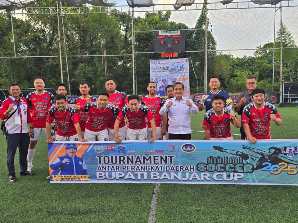 BANJARBARU – Tim Dinas Komunikasi Informatika Statistik dan Persandian (DKISP) Kabupaten Banjar berhasil menaklukkan tim Dinas Perpustakaan dan Kearsipan (Dispersip) dengan skor meyakinkan 2-0, pada laga perdana turnamen minisoccer antar SKPD dan BUMD memperebutkan Piala Bergilir Bupati Banjar, di Palm Minisoccer Banjarbaru, Rabu (13/8/2025) sore.
