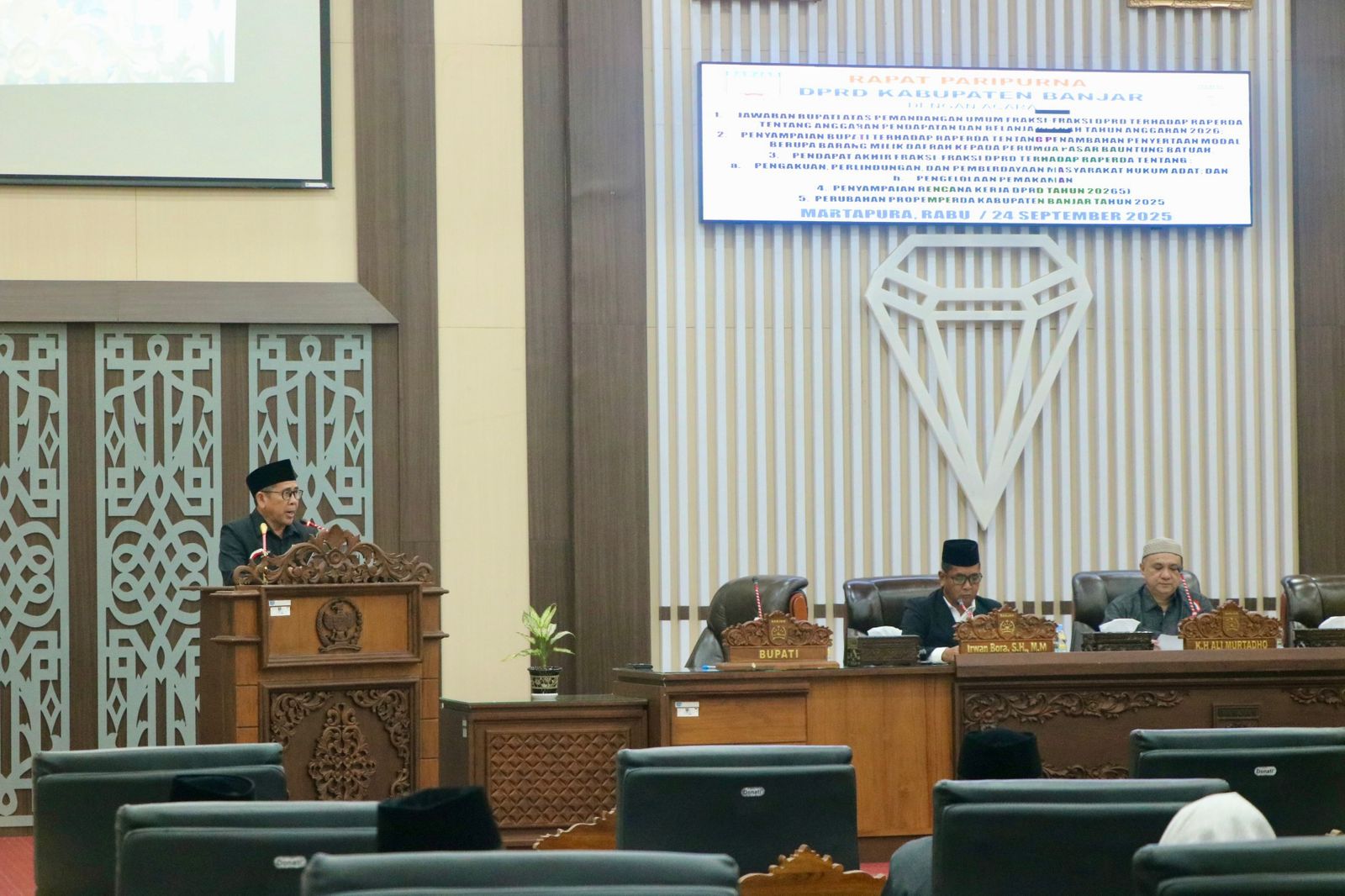 MARTAPURA – Dewan Perwakilan Rakyat Daerah (DPRD) Kabupaten Banjar menggelar rapat paripurna dengan agenda jawaban Bupati atas Pemandangan Umum Fraksi-Fraksi DPRD terhadap APBD Tahun Anggaran 2026, di Aula Paripurna DPRD, Rabu (24/9/2025) malam.