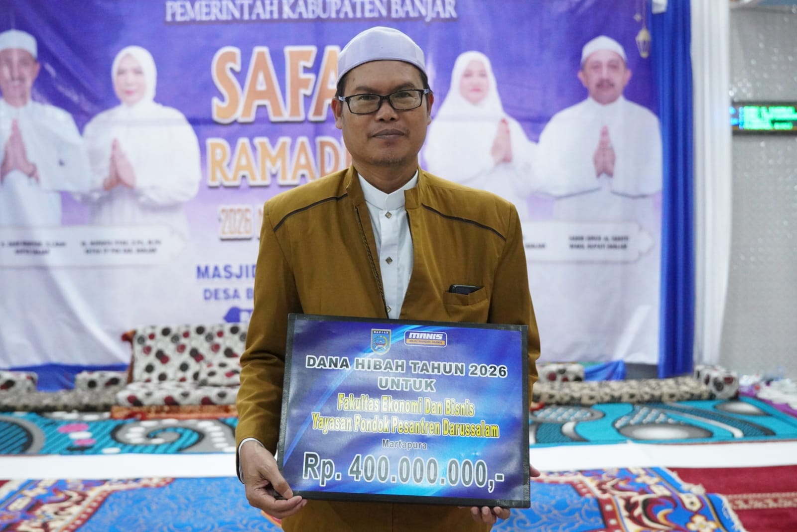MARTAPURA – Bupati Banjar Saidi Mansyur menyerahkan bantuan hibah bidang keagamaan sebesar Rp 400 juta kepada Dekan Fakultas Ekonomi dan Bisnis Islam (FEBI) Institut Agama Islam Darussalam Martapura, Haya Zabidi, pada Safari Ramadan hari ketujuh di Masjid Asshobirin, Desa Bincau, Kecamatan Martapura, Rabu (25/2/2026) sore.