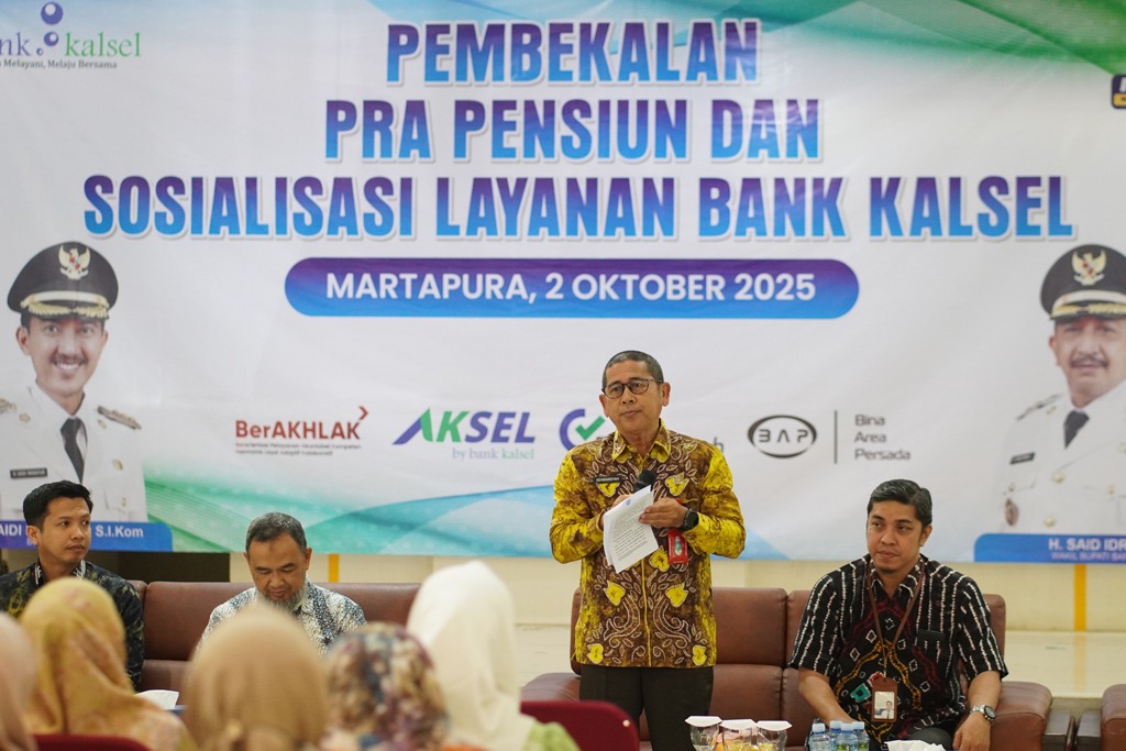 MARTAPURA – Pemerintah Kabupaten Banjar melalui Badan Kepegawaian dan Pengembangan Sumber Daya Manusia (BKPSDM) bekerja sama dengan Bank Kalsel menggelar kegiatan Pembekalan Pra Pensiun dan Sosialisasi Layanan Bank Kalsel, di Guest House Sultan Sulaiman, Martapura, Kamis (2/10/2025) pagi.