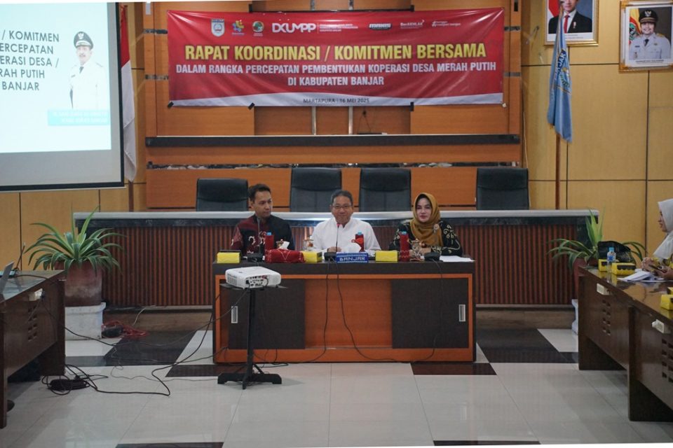 MARTAPURA,- Pemerintah Kabupaten Banjar melalui Dinas Koperasi, Usaha Mikro, Perindustrian dan Perdagangan (DKUMPP) menggelar Rapat Koordinasi Komitmen Bersama Dalam Rangka Percepatan Pembentukan Koperasi Desa/Kelurahan Merah Putih di Kabupaten Banjar, di Aula Barakat Martapura, Jumat (16/5/2025).