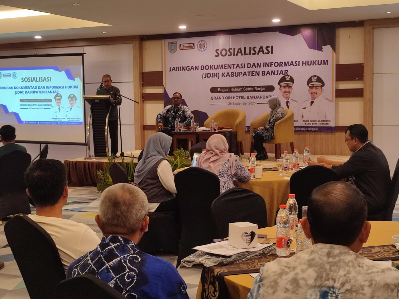 MARTAPURA – Pemerintah Kabupaten Banjar menggelar sosialisasi Jaringan Dokumentasi dan Informasi Hukum (JDIH) sebagai upaya memperluas penyebarluasan produk hukum daerah, di ruang Intan 1 Hotel Grand Qin, Banjarbaru, Jumat (26/9/2025) pagi.