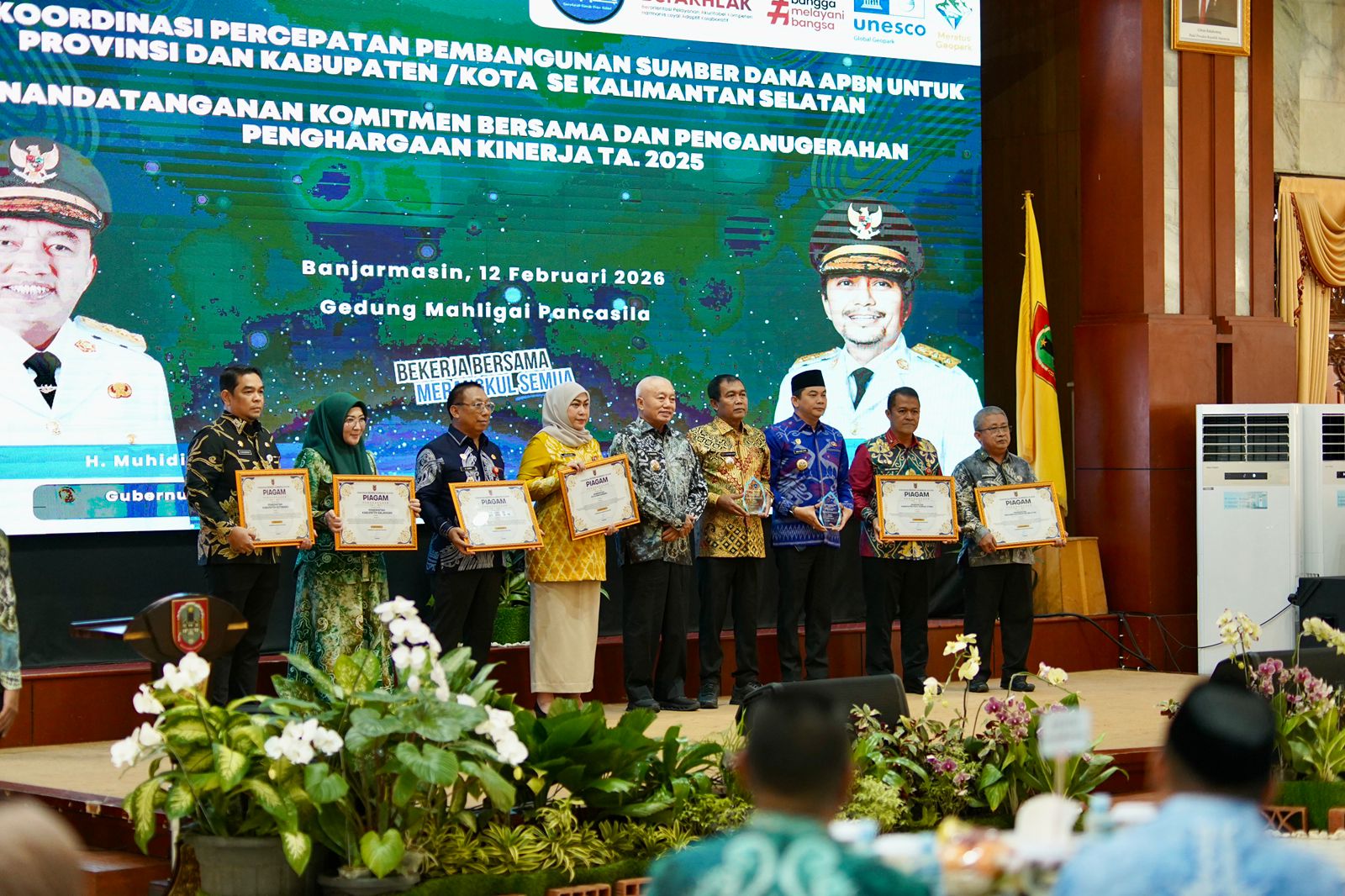 BANJARMASIN – Pemerintah Provinsi Kalimantan Selatan menggelar Rapat Koordinasi (Rakor) Percepatan Pembangunan Sumber Dana APBN Provinsi Kalimantan Selatan, Penandatanganan Komitmen Bersama, serta Penganugerahan Penghargaan Kinerja Tahun Anggaran (TA) 2025, di Gedung Mahligai Pancasila, Banjarmasin, Kamis (12/2/2026) pagi.