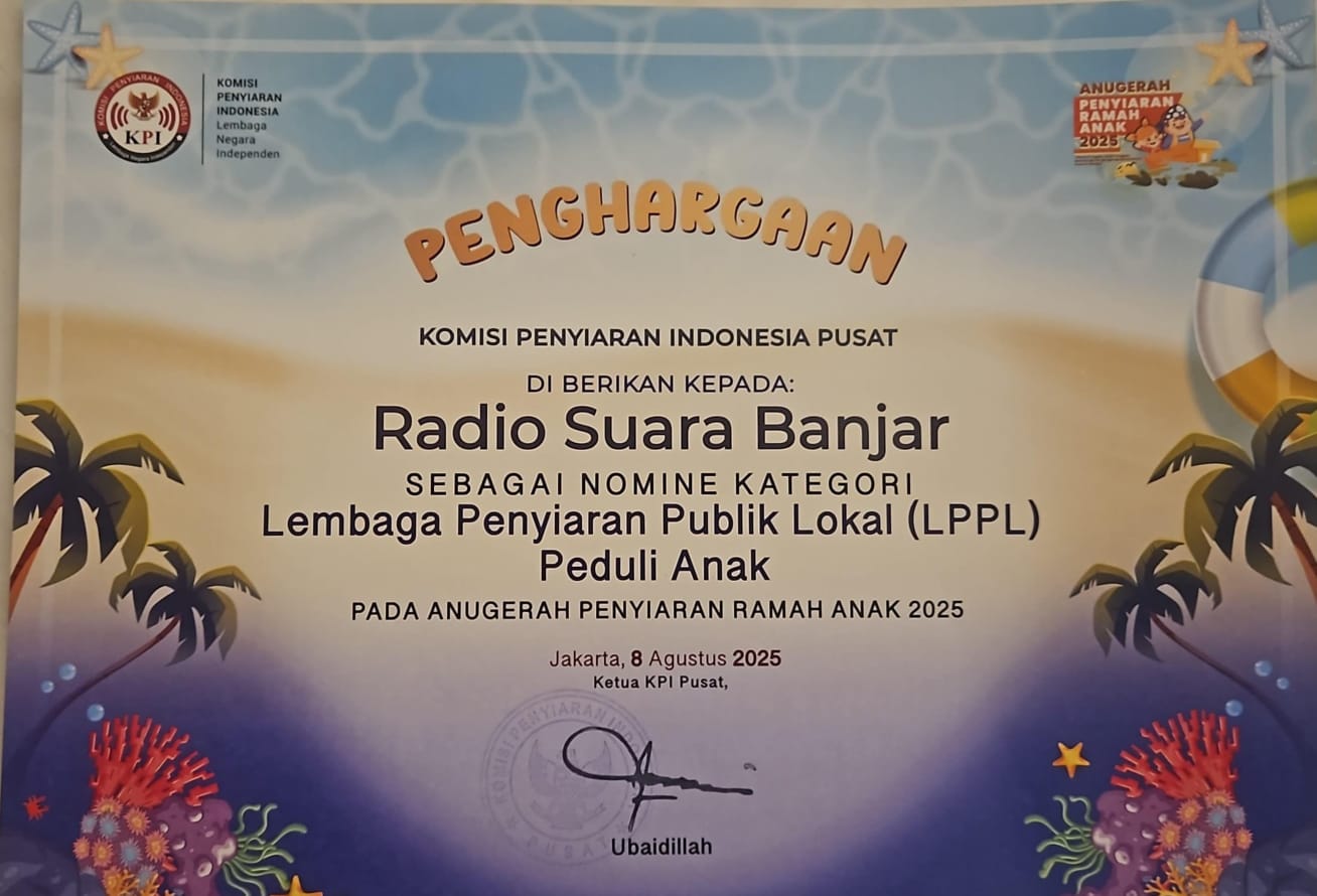 JAKARTA – LPPL Radio Suara Banjar berhasil menembus nominasi nasional dalam ajang Anugerah Penyiaran Ramah Anak 2025 yang diselenggarakan Komisi Penyiaran Indonesia (KPI) Pusat. Melalui program “RAHATAN” (Radio Sahabat Anak), Radio Suara Banjar bersaing bersama empat nominasi radio daerah lainnya dalam kategori siaran radio ramah anak terbaik.