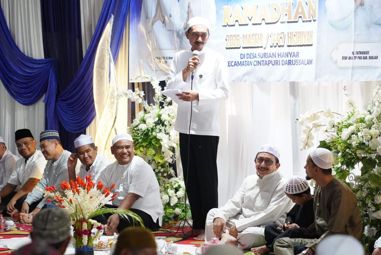 CINTAPURI DARUSSALAM – Safari Ramadan terakhir, Bupati Banjar H Saidi Mansyur bersama Wakilnya Habib Idrus Al Habsyi dan Ketua TP PKK Hj Nurgita Tiyas beserta rombongan sambangi Masjid Baitul Mustaqim, Desa Surian Hanyar, Kecamatan Cintapuri Darussalam, Sabtu (28/2/2026) sore.